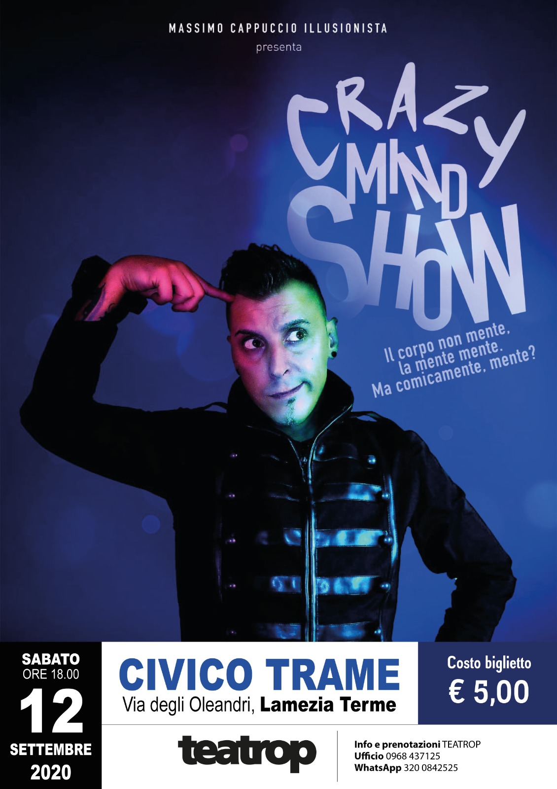 Massimo Cappuccio Illusionista presenta Crazy mind show il corpo non mente. la mente mente. Ma comicamente. mente? Costo biglietti 5 euro info e prenotazioni Teatrop […]