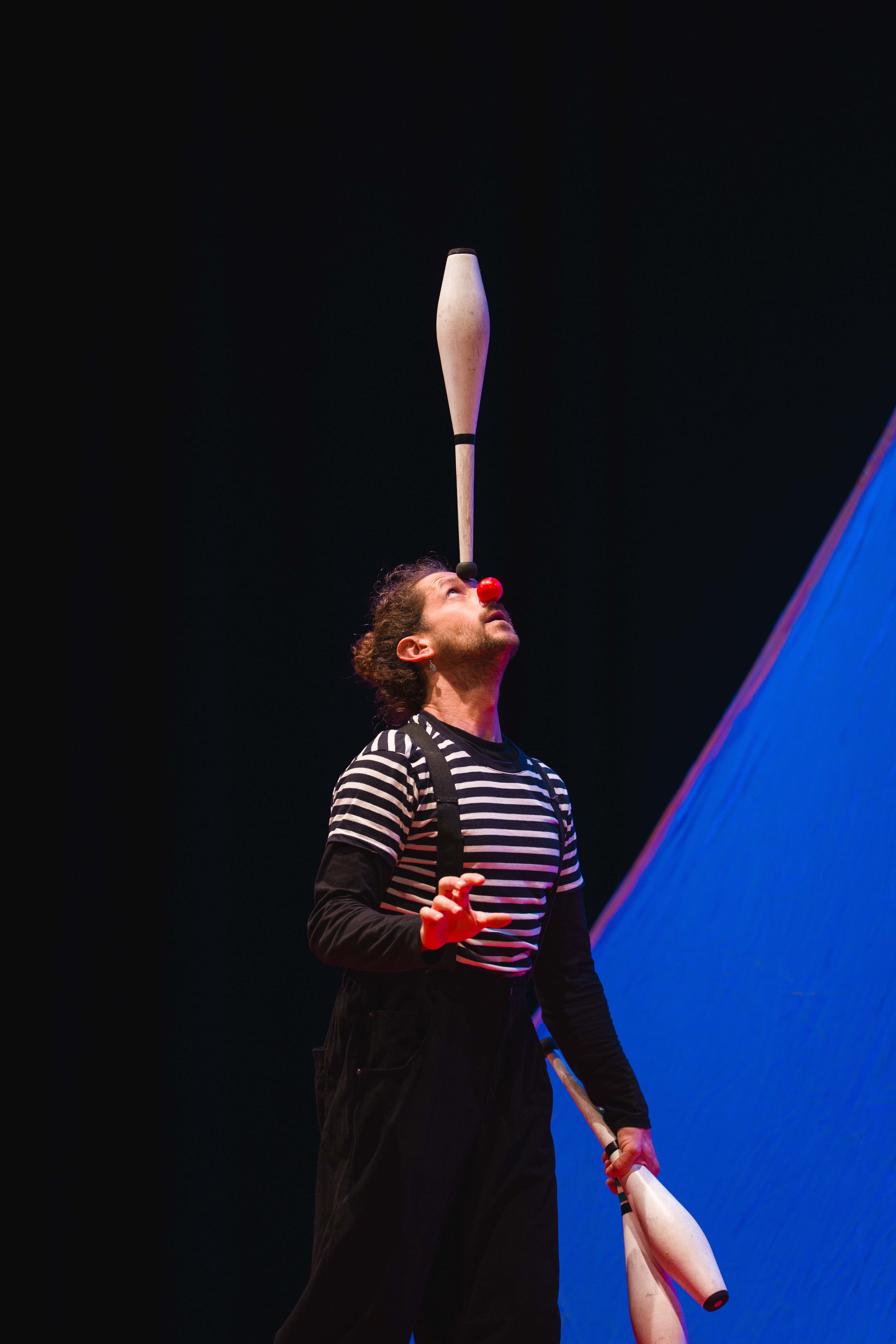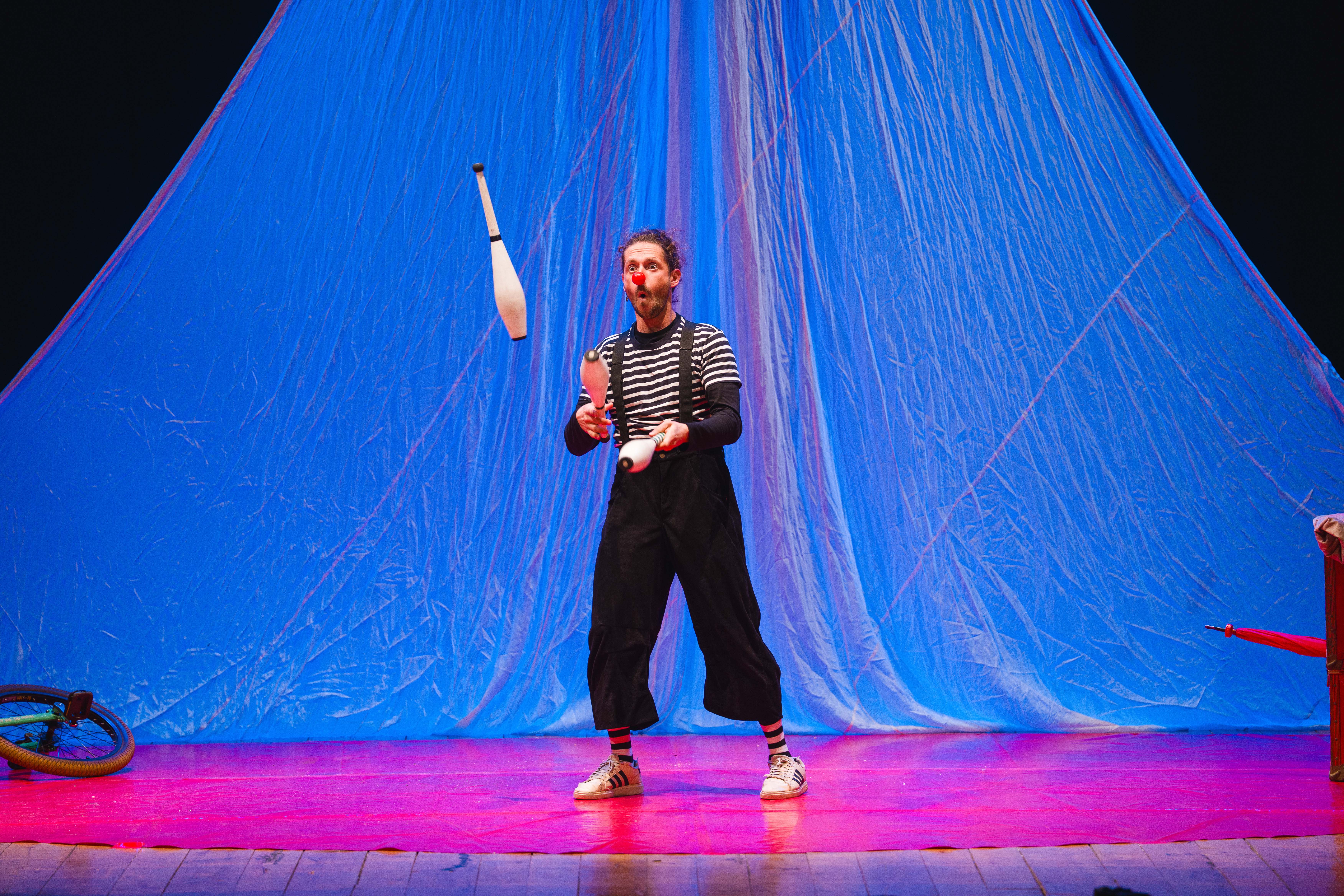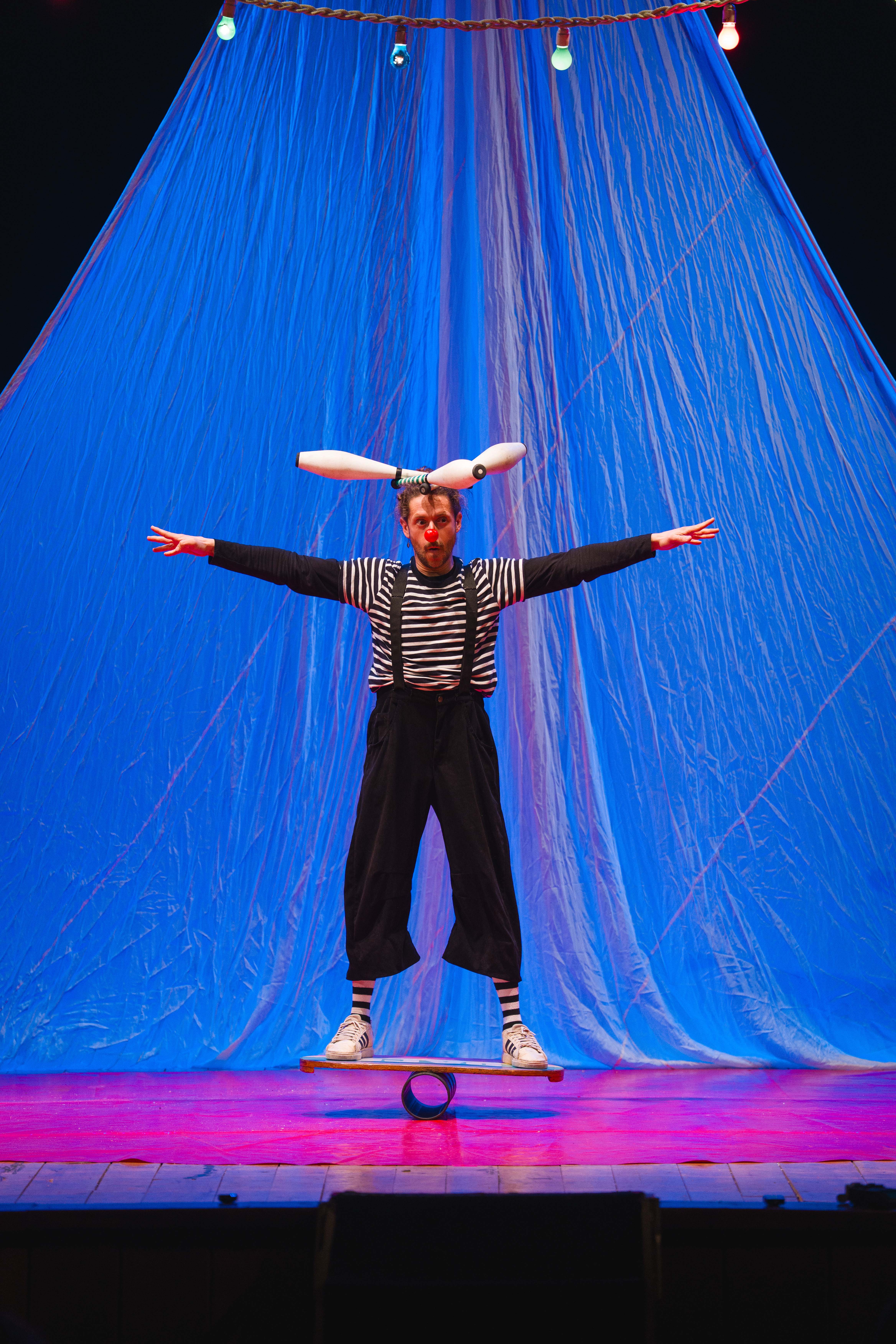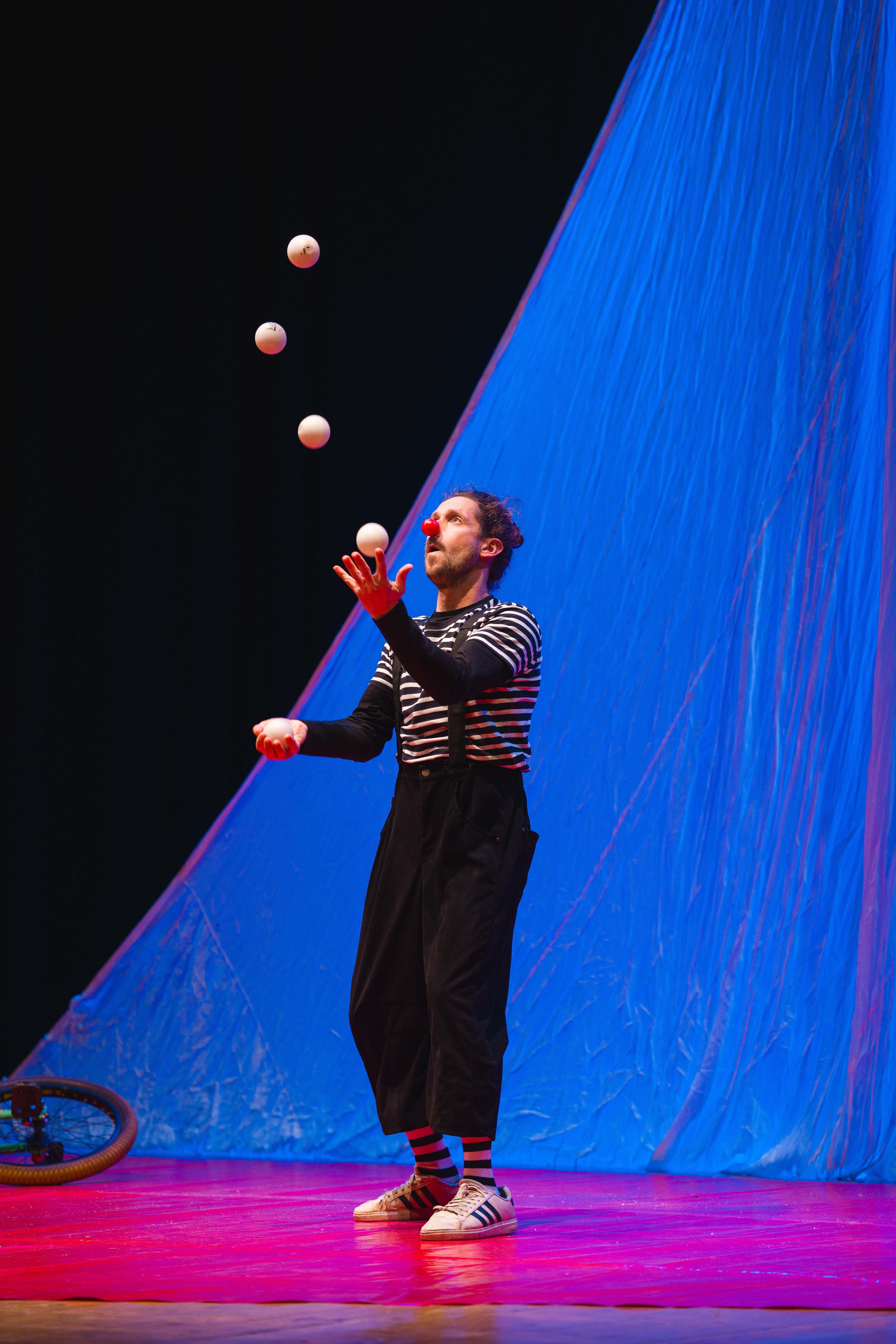 Tecnica: Spettacolo di clownerie non verbale con arti circensi, unisce giocoleria, funambolismo e teatro fisico in un linguaggio universale fatto di musica, ritmo e relazione diretta con il pubblico.