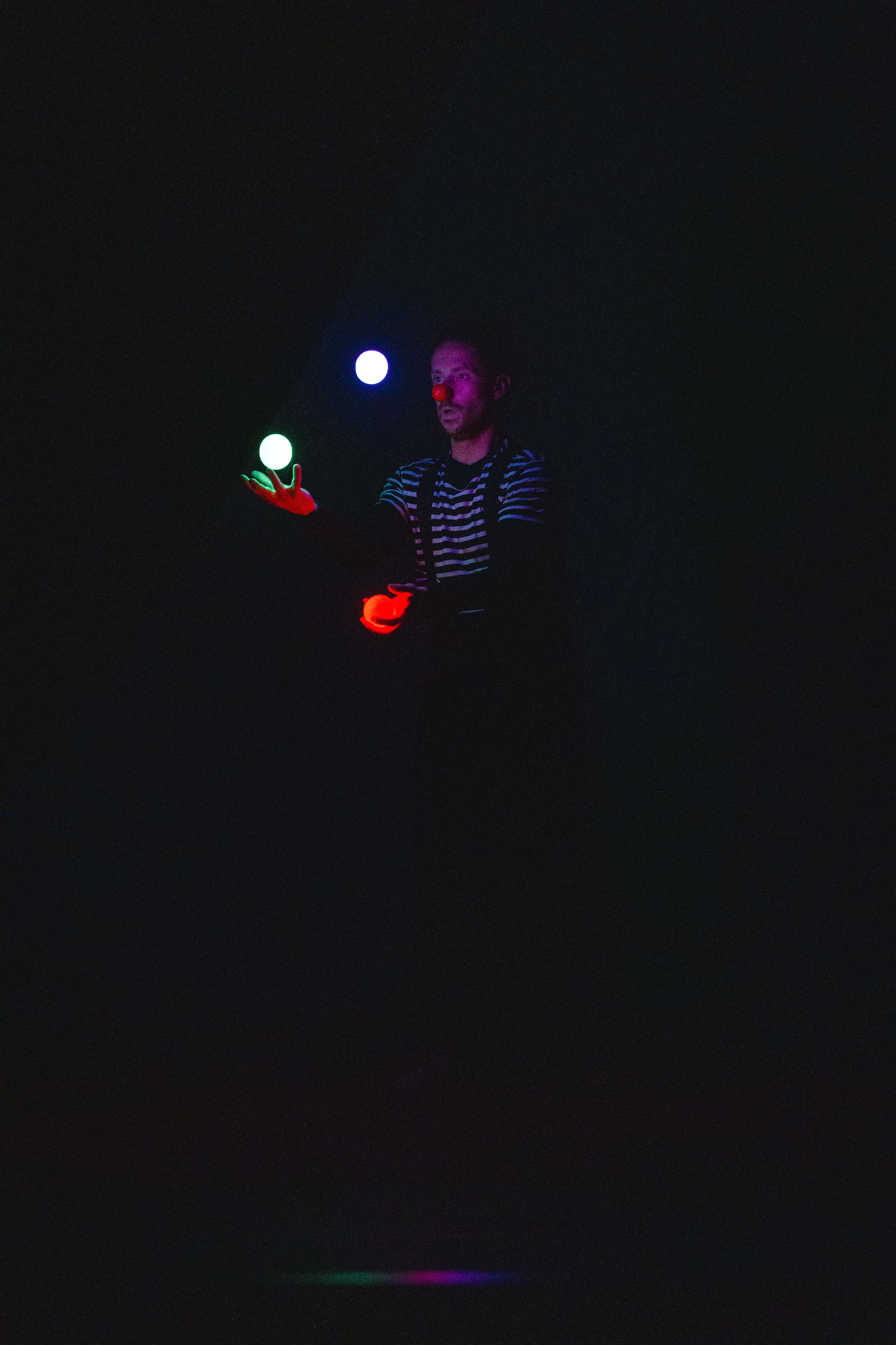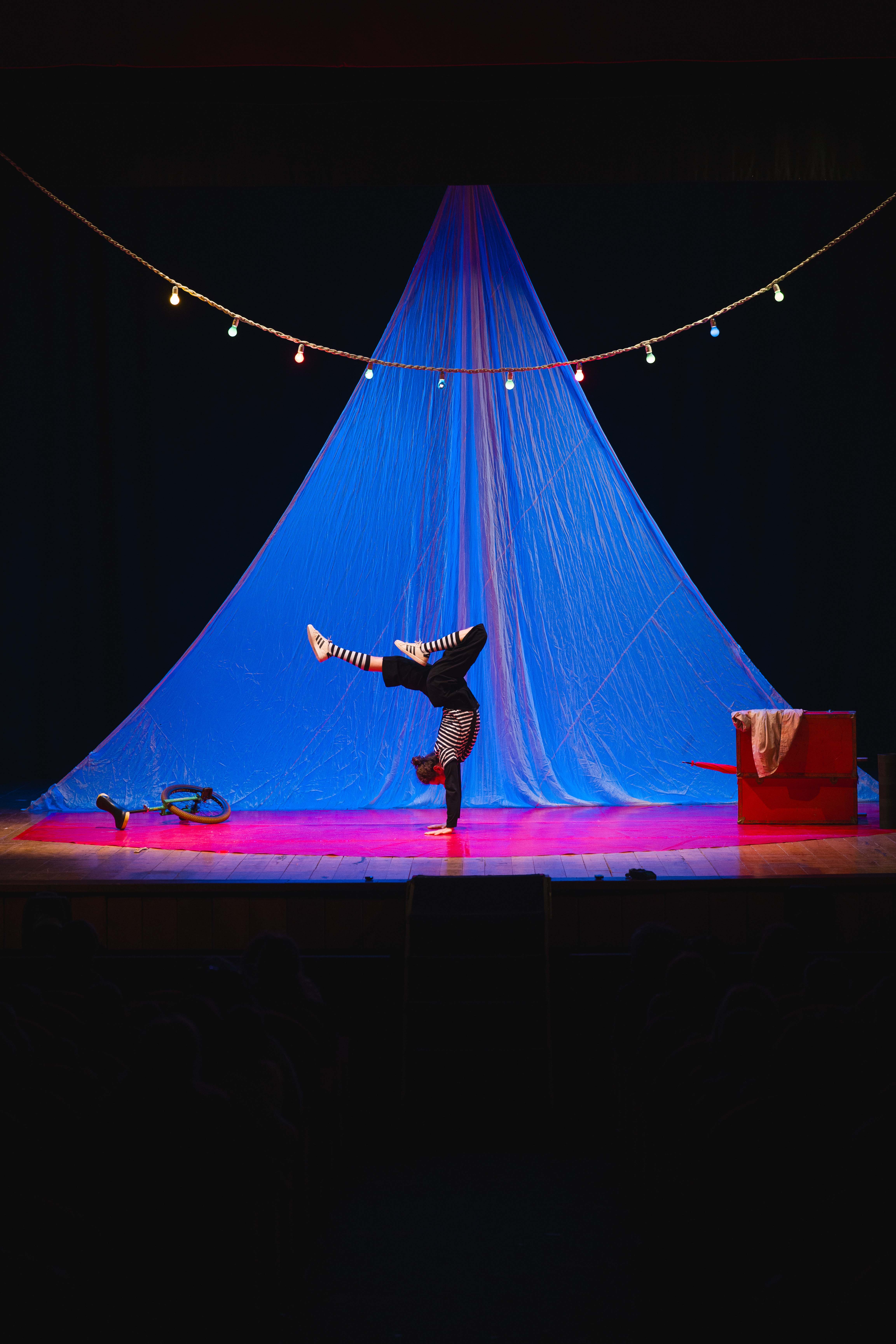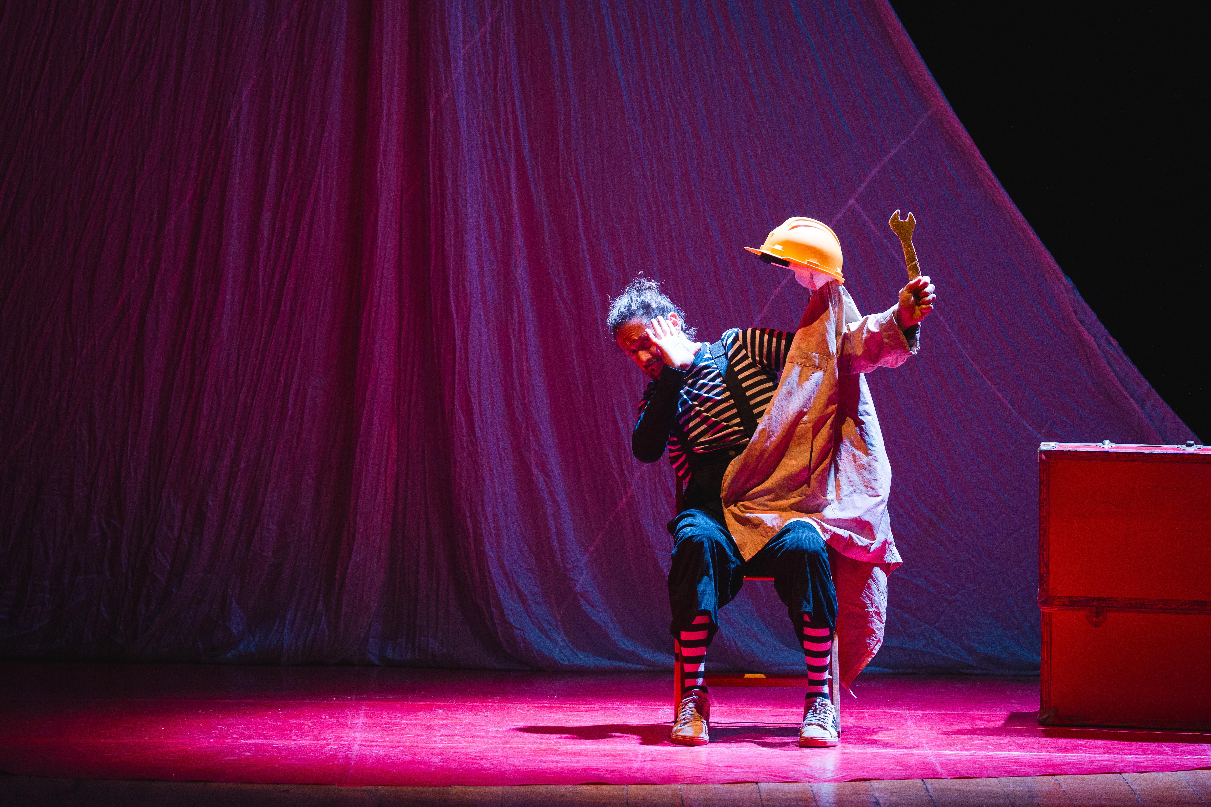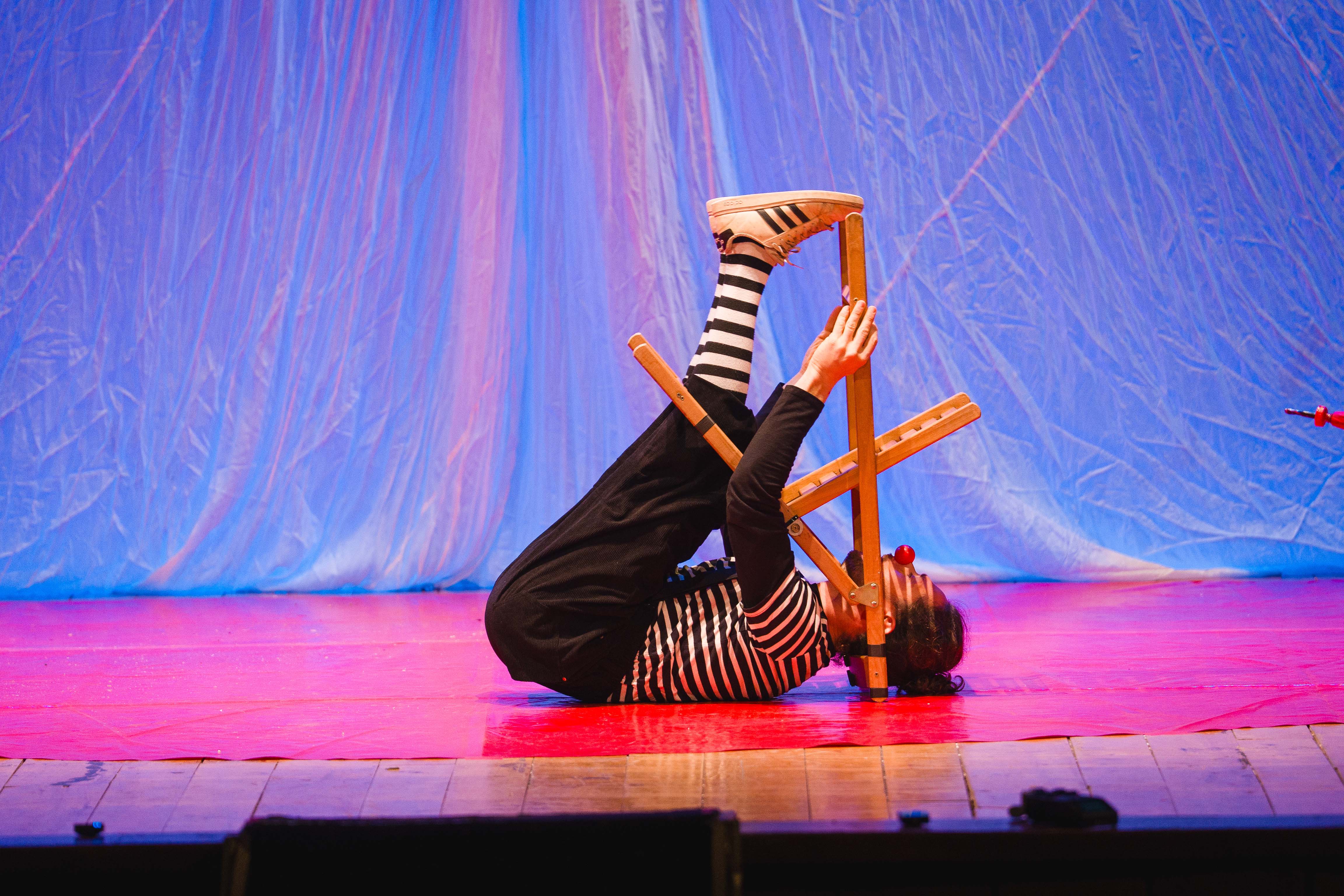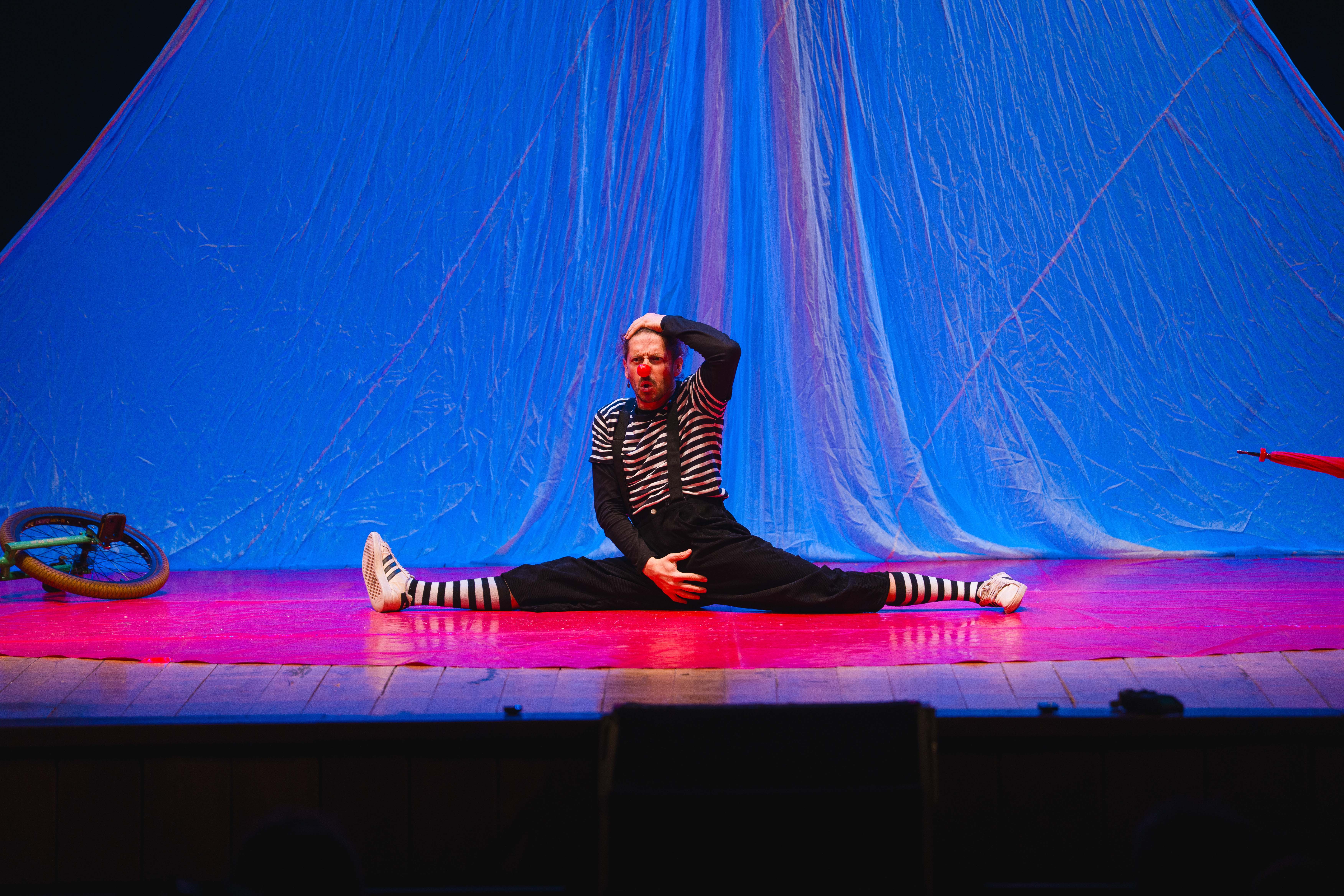 Tecnica: Spettacolo di clownerie non verbale con arti circensi, unisce giocoleria, funambolismo e teatro fisico in un linguaggio universale fatto di musica, ritmo e relazione diretta con il pubblico.
