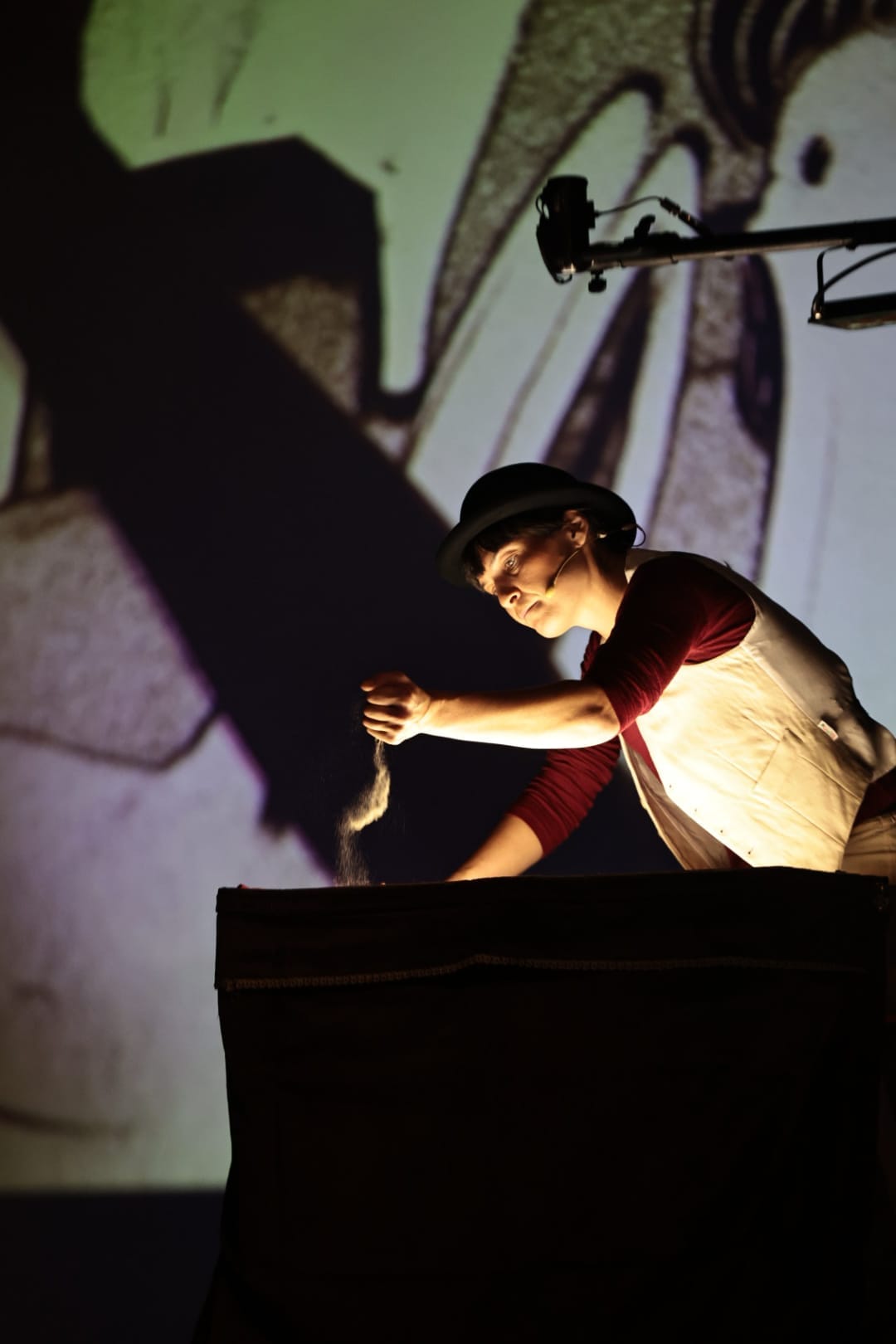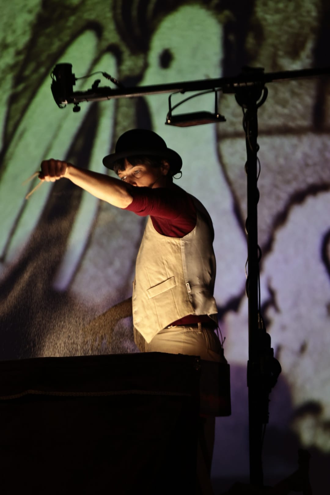 Sul grande schermo, le mani di Greta Belometti danno forma alla sabbia attraverso la tecnica della sand art dal vivo: figure che nascono, si trasformano e scompaiono, seguendo il ritmo della musica e della narrazione. La sabbia diventa così materia narrativa, “inchiostro” luminoso che disegna emozioni e suggestioni.